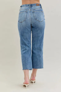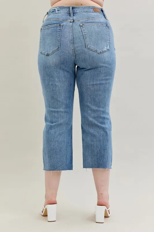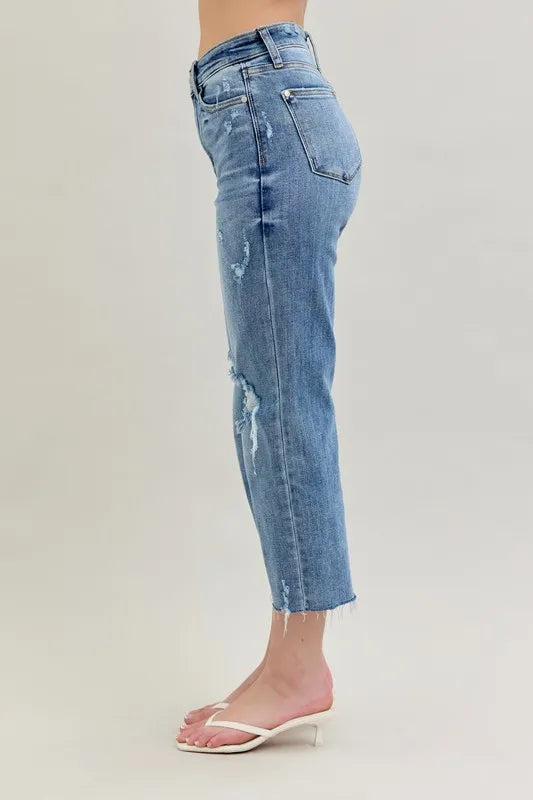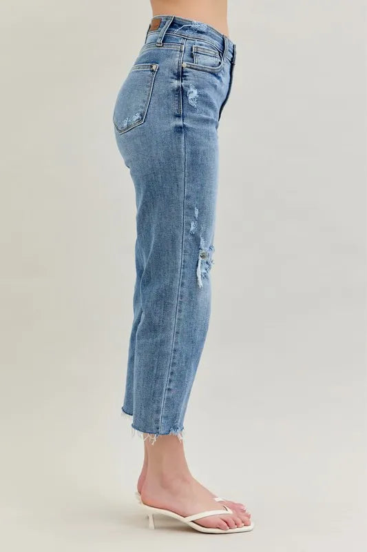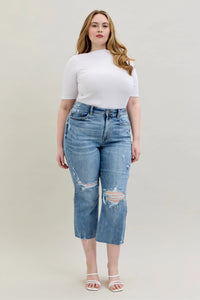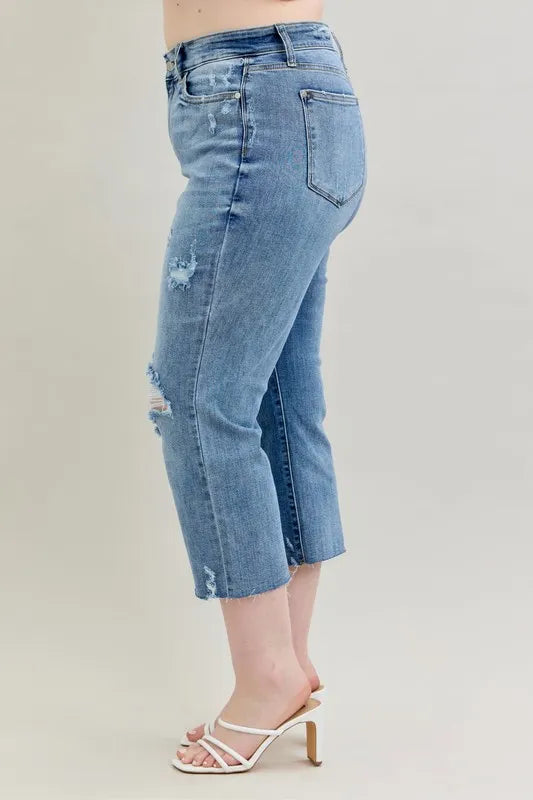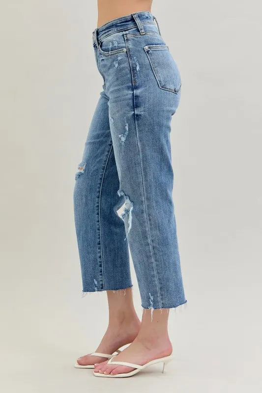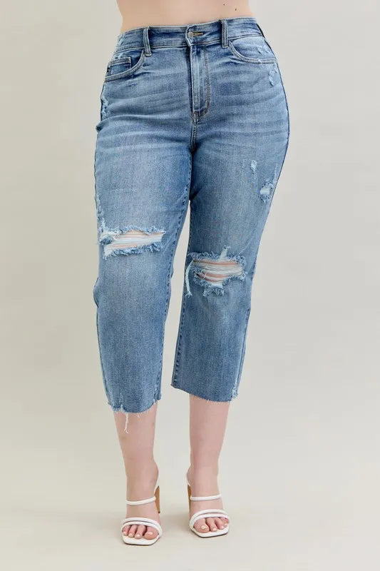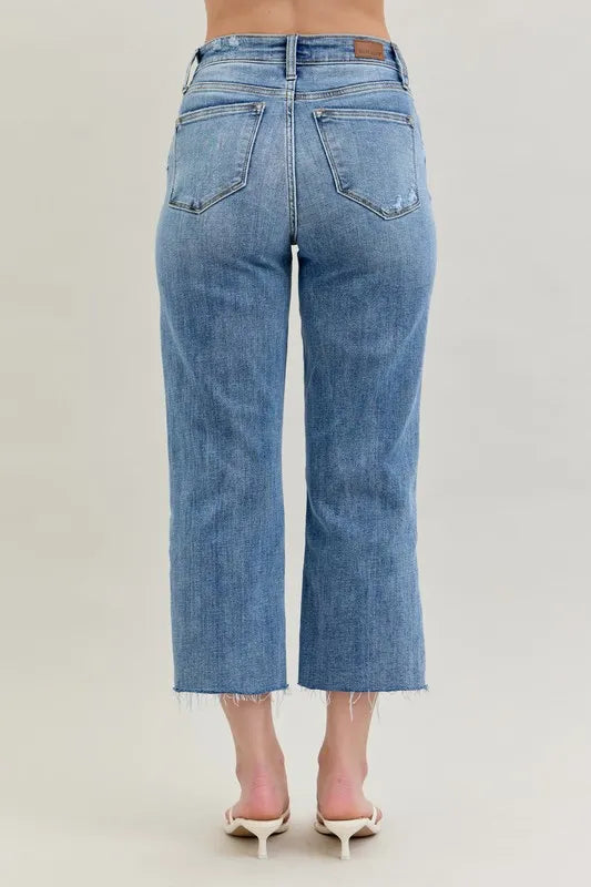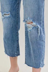 These high-waist cropped wide-leg jeans feature a distressed design for a trendy and edgy look. The high waist design offers a flattering fit and adds a modern touch to the wide-leg silhouette. The distressed detailing lends a cool and casual vibe to the jeans, perfect for creating a fashion-forward outfit. Made with high-quality denim, these jeans are both stylish and comfortable for everyday wear. Elevate your wardrobe with these chic and versatile jeans that effortlessly combine a high waist, cropped length, wide-leg silhouette, and distressed finish for a standout ensemble.